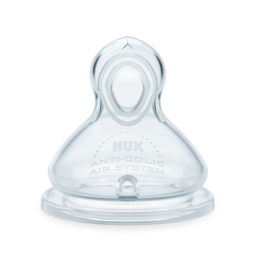 NUK独自のカタチ。赤ちゃんのお口の中で柔軟にカタチを変えるニップルはまるでままのおっぱい。ミルクの消化やお口のフィット感、げっぷ予防を考えたやさしい機能が充実。