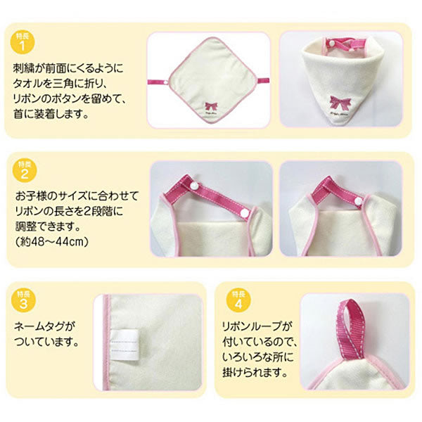 赤ちゃんのときはループ(2段階に調整可能。約44~48cm)をとめてビブとして、保育園や幼稚園になったらループ付ハンドタオルとして使えます。