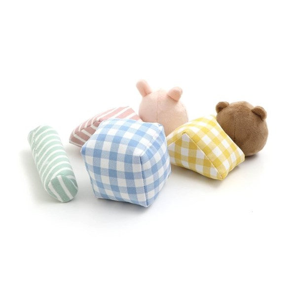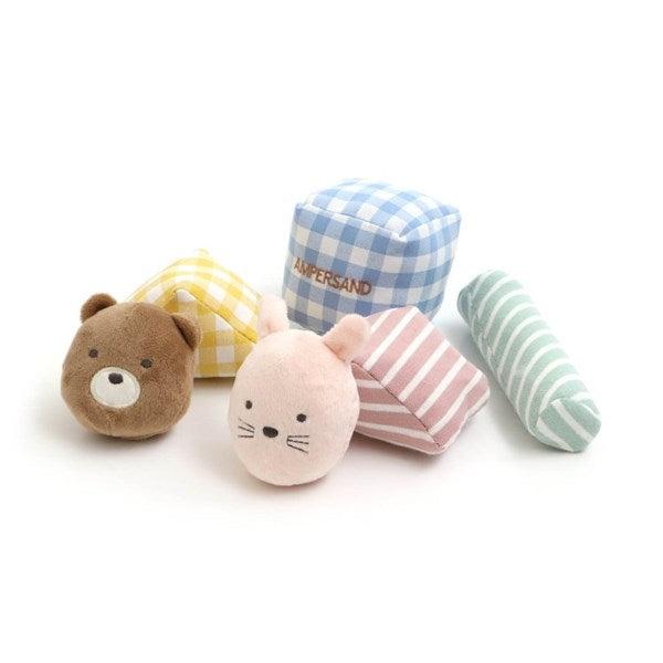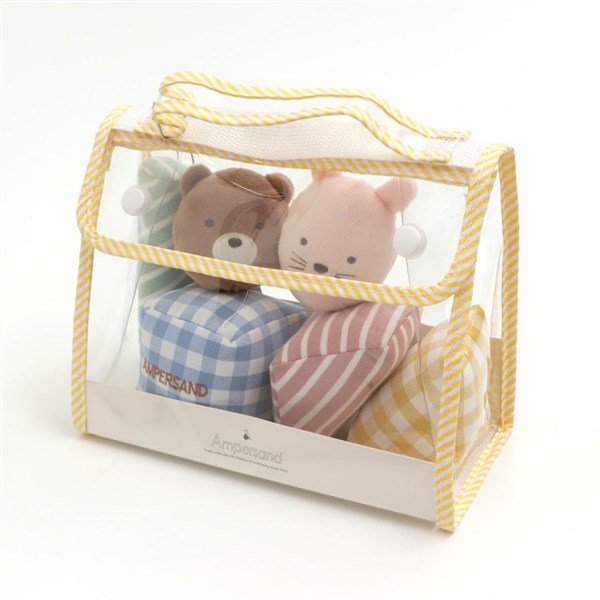 Ampersand(アンパサンド)のおもちゃ「ファブリックラトルセット」は、カラフルなデザインが人気!ギフトにもGOOD!いろんな形のラトルセットです。くま・うさぎ・四角は揺らすと「リンリン♪」と音が鳴り、三角は触ると「バリバリ♪」と音が鳴り、筒形は押すと音が鳴ります。四角と三角は積み木として遊ぶ事も出来ます。