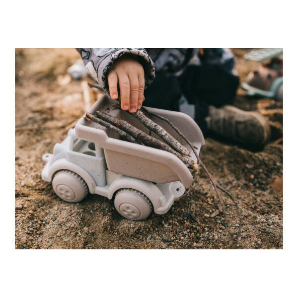 全長約15cmのLサイズ。シンプルでかわいいツートーンカラー。ダンプやショベルは動くので、お砂場遊びに最適。パッケージはリサイクル紙を使用したギフトボックスタイプ。