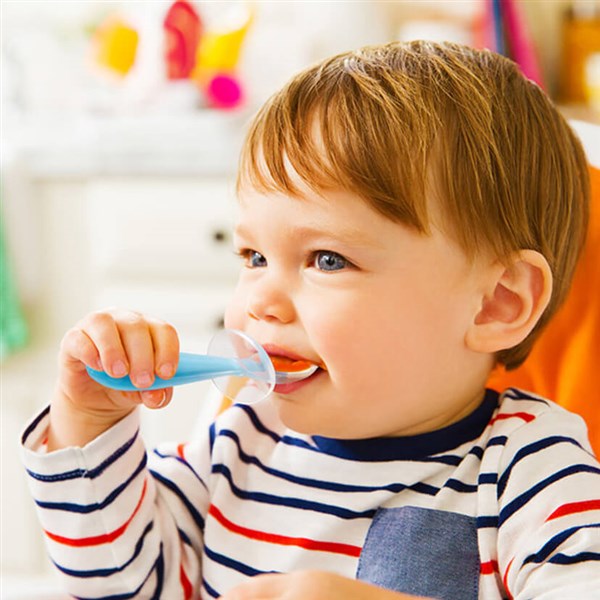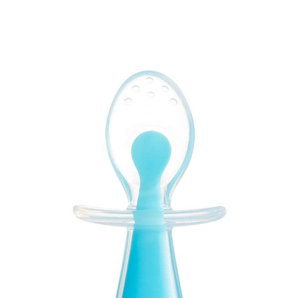 のど突きガードつきのベビースプーン。オールシリコーンで口当たりやわらか。のど突きガートはスプーンレストにもなって衛生的。