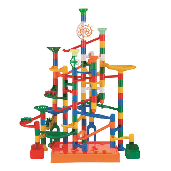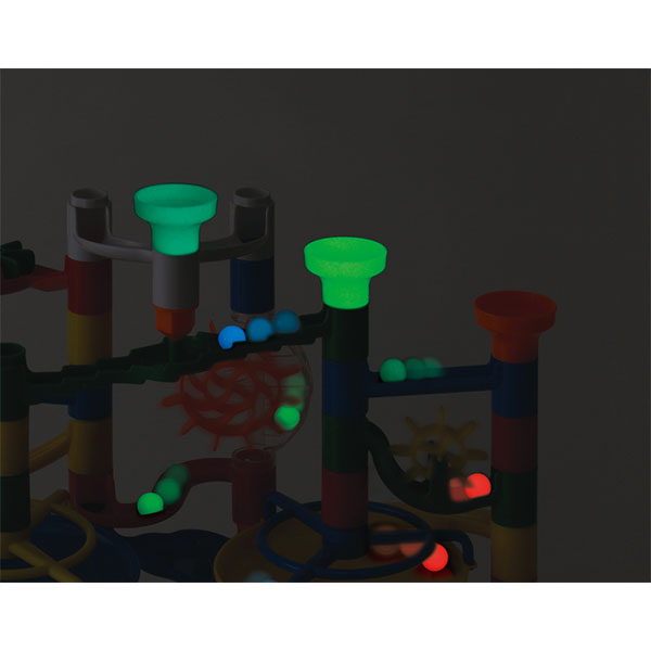 今回は31種類100個のパーツで組み立てるコースも迫力満点の大きさで、お部屋を暗くすると光る蓄光ボールが12個と従来のカラーボールが12個で合計24個のボールがセットになります。