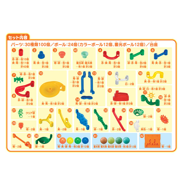 台座・・1個 ボール・・24個(カラーボール12個 蓄光ボール12個) パーツ・・31種100個