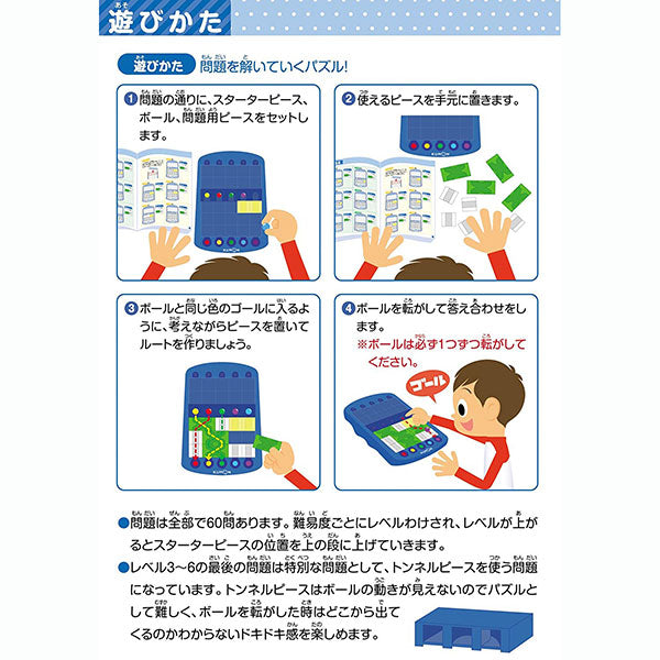 セット内容:ボード:1台、スターターピース:1個、直線ピース(白);12個、交差ピース:12個、トンネルピース:2個、問題用直線ピース(黄):3個、ボール:10個(赤、黄、緑、水色、紫:各2個)、問題集:1部