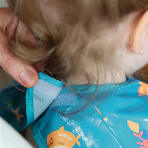 3.巻きつけたストラップの端のフック面を引っ張り、ビブの端にあるループ面に付けて固定します。