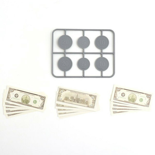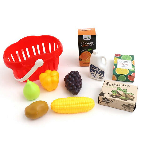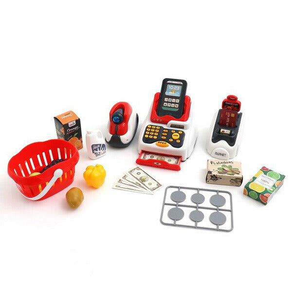 キャッシャー台、タブレット、スキャナー、カードリーダー、カゴ、トウモロコシ、パプリカ、じゃがいも、洋ナシ、ぶどう、ミルク、オレンジジュース、フルーツスナック、ピスタチオ、クレジットカード、お札×15、コイン×6、シール