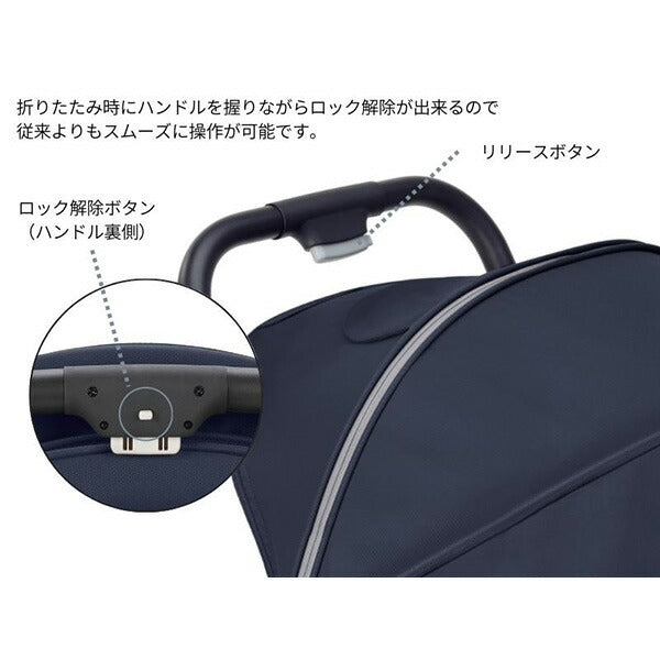 耐荷重が22kgとなり、4歳頃までご使用頂く事ができるようになりました。そして前後輪と旋回部にボールベアリングを搭載してさらにスムーズな走行が可能に。さらにロック解除レバーが押しやすいボタンに変わって折りたたみ操作が簡便になり、ショッピングバスケットは深さがプラスされて容量がアップしています。
