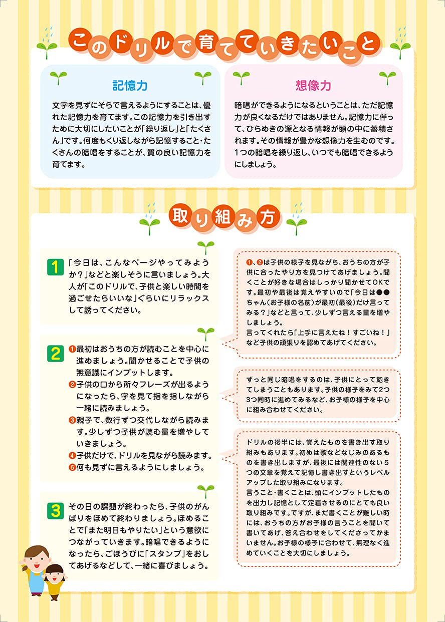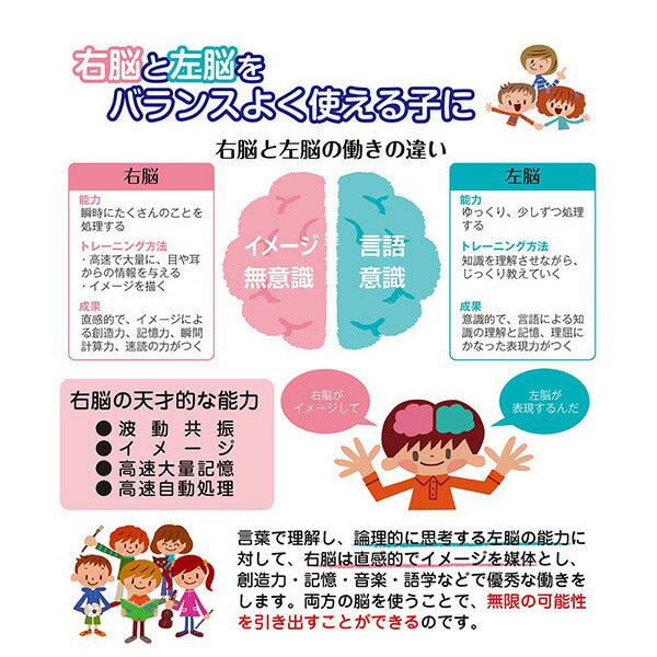 ・言葉で理解し、理論的に思考する左脳の能力に 対して、右脳は直感的でイメージを媒介とし、創造性、記憶、音楽、語学などで優秀な働きをします。両方の脳を使うことで、無限の可能性を引き出すことができるのです。