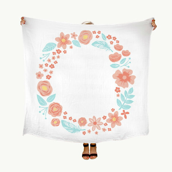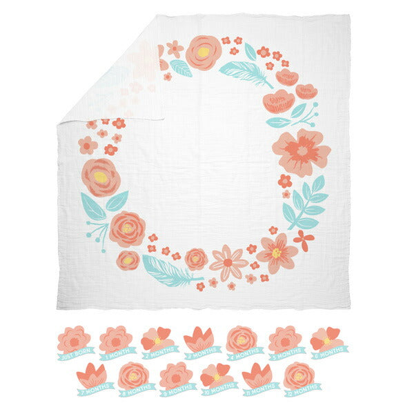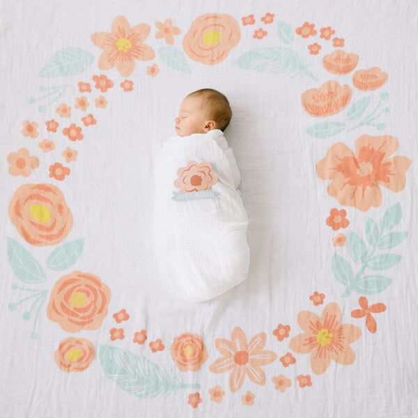 スワドルに赤ちゃんを寝かせて毎月の成長を撮影 通気性が高く、肌触りの良いモスリンコットン製でブランケットとしてもお使いいただけます