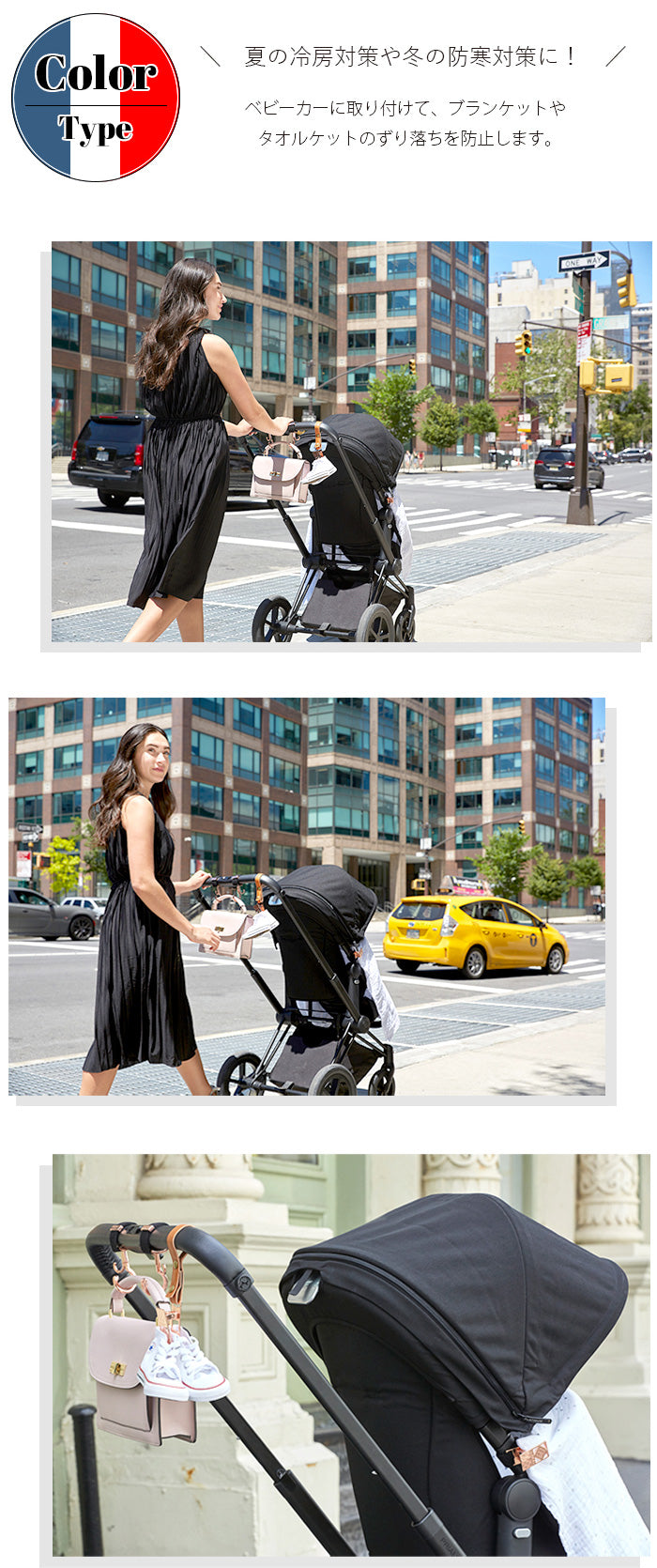 おしゃれにベビーカーをドレスアップできるブランケットクリップ。