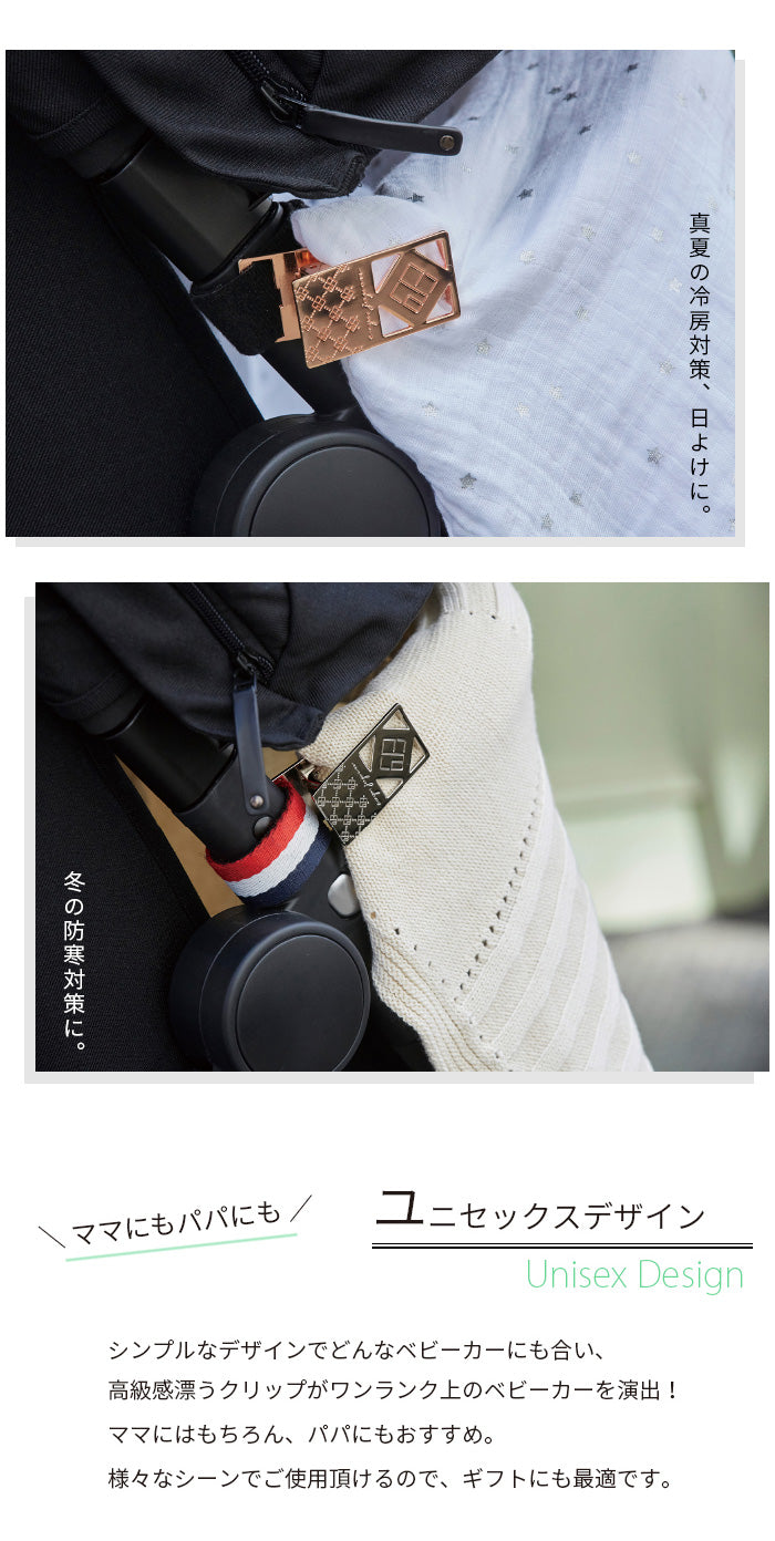 ●シンプルなデザインでどんなベビーカーにも合い、高級感漂うクリップがワンランク上のベビーカーを演出!ママにはもちろん、パパにもおすすめ。様々なシーンでご使用いただけるので、ギフトにもおすすめです。