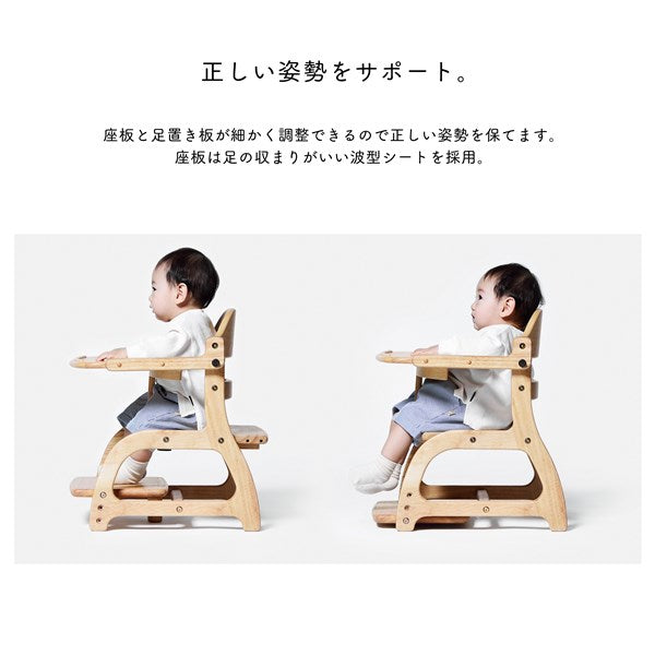 また、お子さまの成長に合わせて足置き板は上下に3段階、座板は前後に4段階の調整が可能です。細かく調整ができ、かつ背板と座板の角度を90度で設計しているため、お子さまの正しい姿勢をサポートします。また足置き板はしっかりと足裏全体がつくように、広い足置き板となっています。みなさまのご要望を多くいただいたことより、本モデルからテーブル付きのモデルに統一化。仕様においてもガードの全高を低くし、お子さまが成長して座面の奥行きを変えた時も、ガードが使えるように変更。テーブルに干渉せず、より安心してお使いいただけるようになりました。また、万が一お子さまが足置き板に乗ってしまっても、お怪我につながらないよう足置き板のサポートパーツを追加しました。3 段階全ての高さに合わせた安定感を実現し、より安心してお使いいただけます。日本的な床暮らしなら、天井も高く感じられるし、いいことだらけ。理にかなった子ども家具なのです。