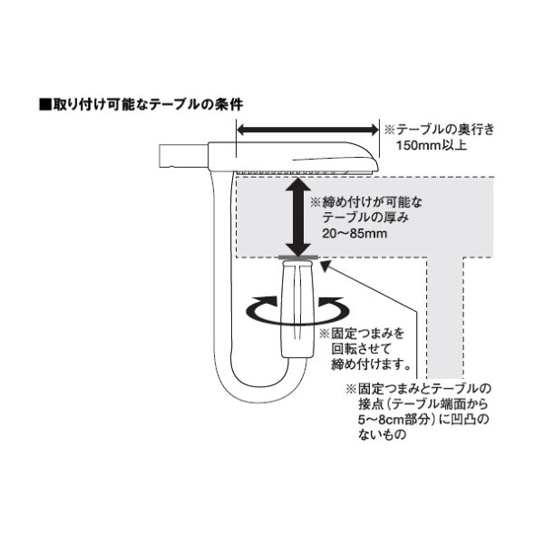 ※取り付けできるテーブルには条件があります。説明図をご参照頂きご使用のテーブルへの取り付け可否をご確認ください。