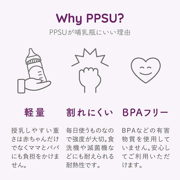 PPSU(ポリフェニルサルホン)はプラスチックの軽さはもちろん、お手入れの際の消毒や滅菌の熱に強い耐久性を持っています。また、色や臭いをを吸収しにくいのも特徴です。