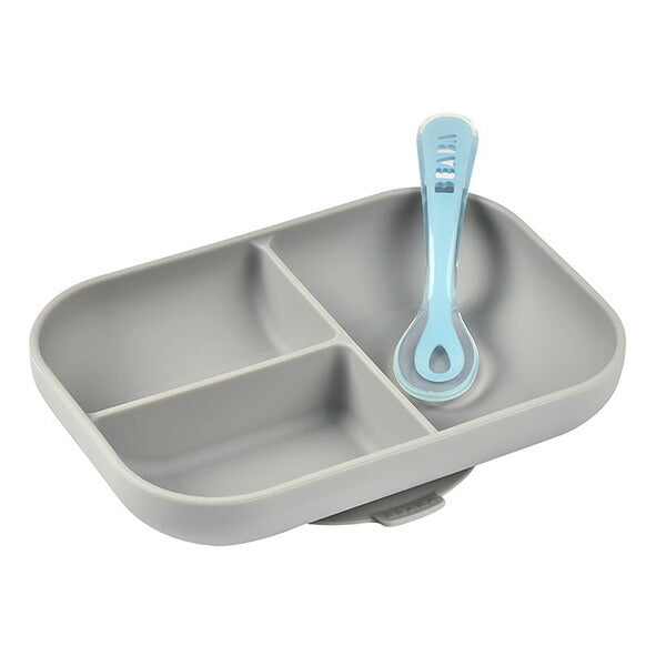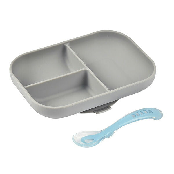 BEABA 吸盤付きシリコンプレート&スプーンセット グレー ベアバ テーブルに吸盤で固定できる【送料無料 沖縄・一部地域を除く】