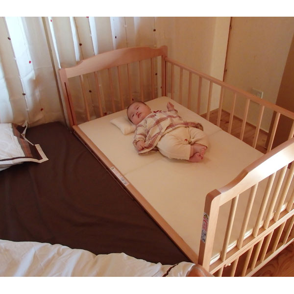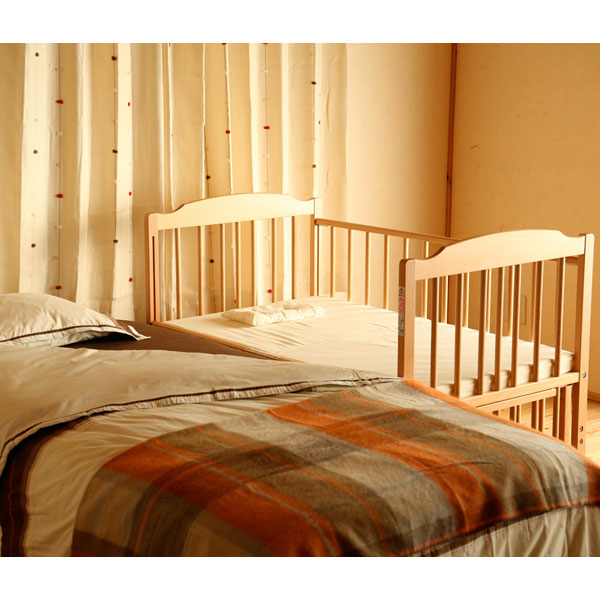 両側の柵が開閉できるので、パパ、ママのベッドでベビーベッドをはさんで使用できます。