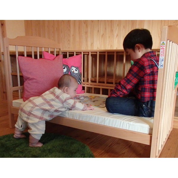 敷布団を敷いた場合、敷布団の上と下げた手すりがフラット(ほぼ同じ高さ)だから、赤ちゃんの着替え、おむつ交換するのに柵が邪魔になりません。(床板上段で使用の場合)