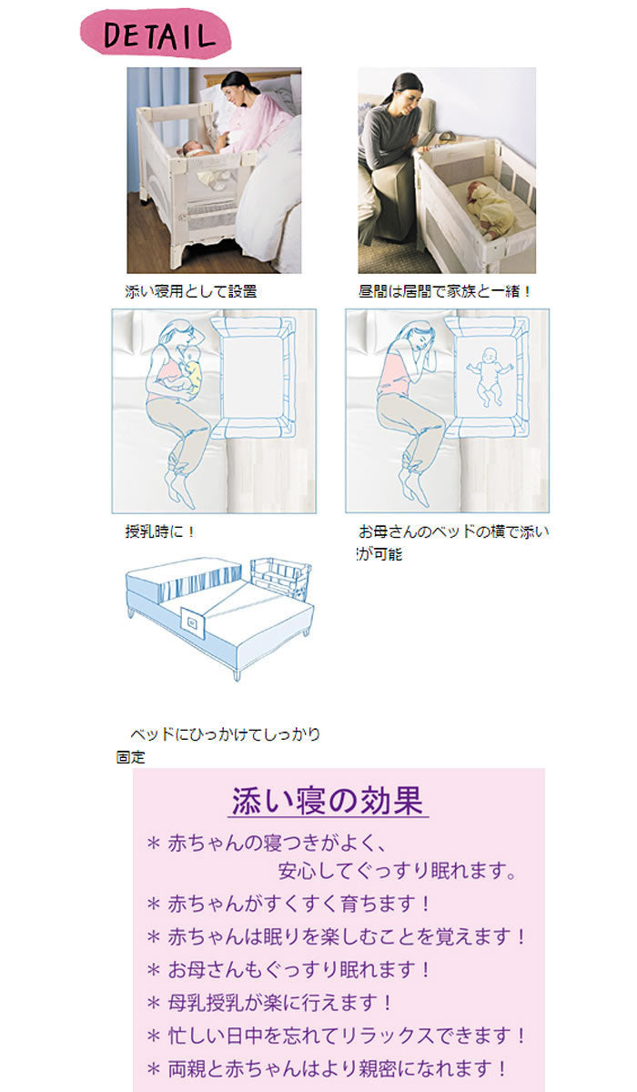「2」 「添い寝は赤ちゃんの精神状態を安定させるので良質の睡眠を与え、同時に両親にも良質の睡眠を与えます」という『ベビーブック』の著者Dr.W.Searsの考えに基づいて開発された画期的な構造を持つユニットです。