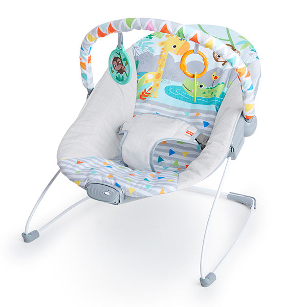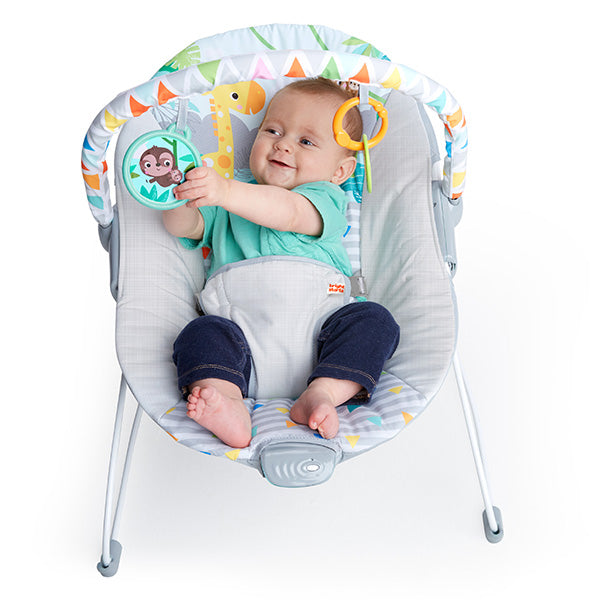 心地良いバイブレーション機能を搭載したバウンサーはシンプルな構造ながらも使い勝手抜群!2つのおもちゃがついたトイバーは、簡単に取り外す事が出来るので赤ちゃんのお世話の邪魔になりません。包み込むようなシート設計、3点ハーネスで赤ちゃんをしっかり支えます。