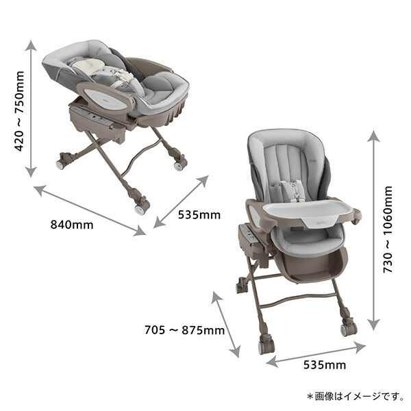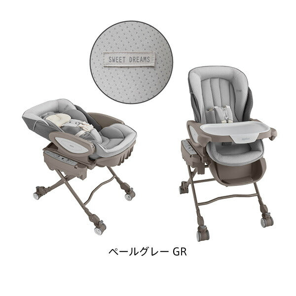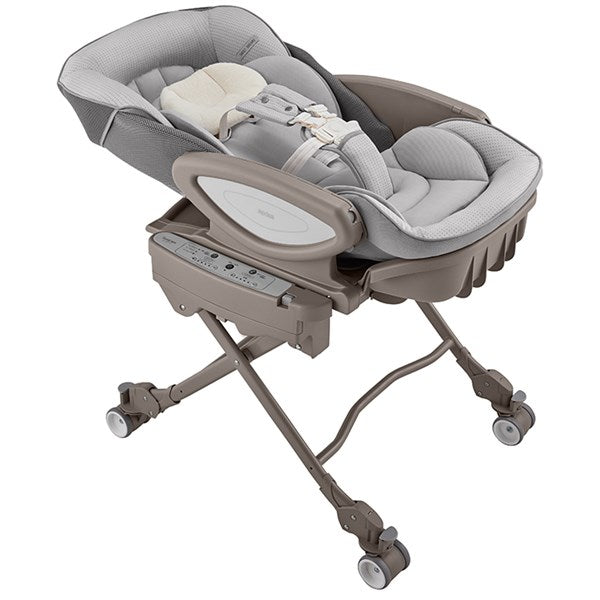 「ユラリズム オート AC」は、おうちの中のいろんな場面で活躍し4歳頃まで長く使えるハイローベッド&チェアの電動スウィングタイプ。