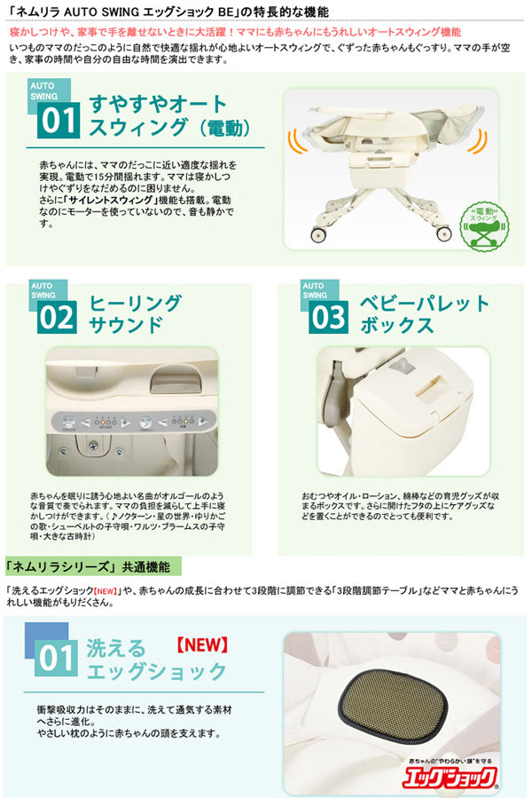 電動で15分間揺れ、赤ちゃんの眠りをサポートする、コンビ独自のスウィング機能を搭載。