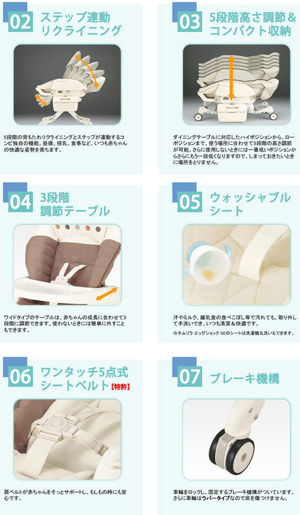 5段階のリクライニングとステップが連動するコンビ独自の機能。
