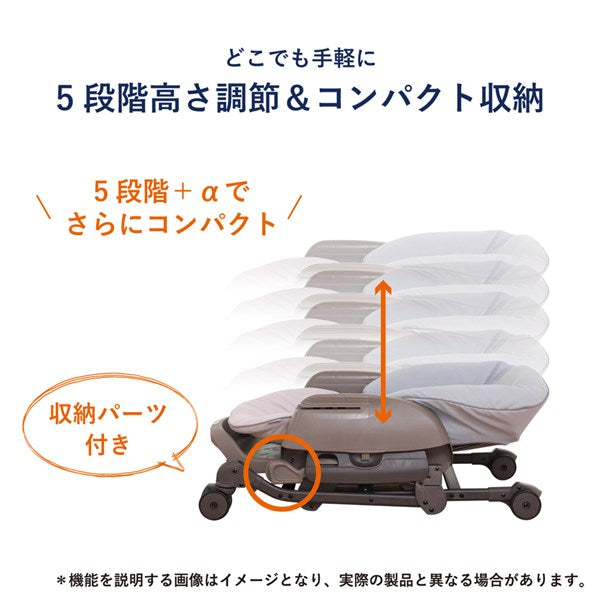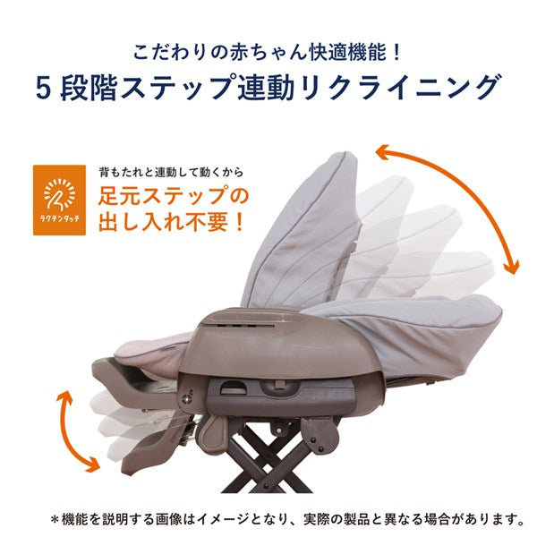 5段階の背もたれリクライニングとステップが連動し、片手のラクチン操作でいつでも赤ちゃんを快適な姿勢に保ちます。