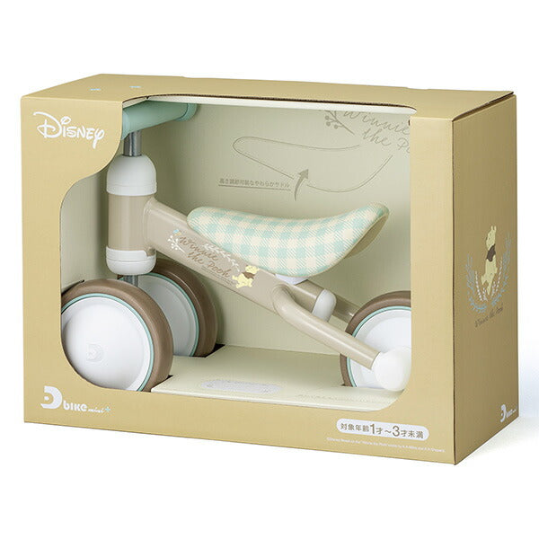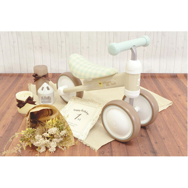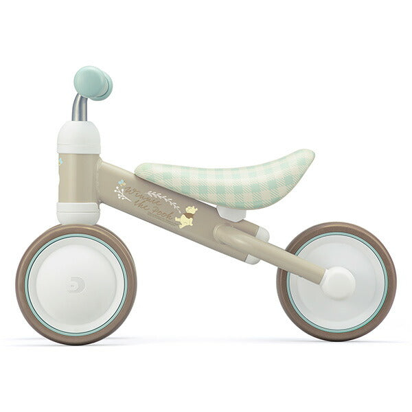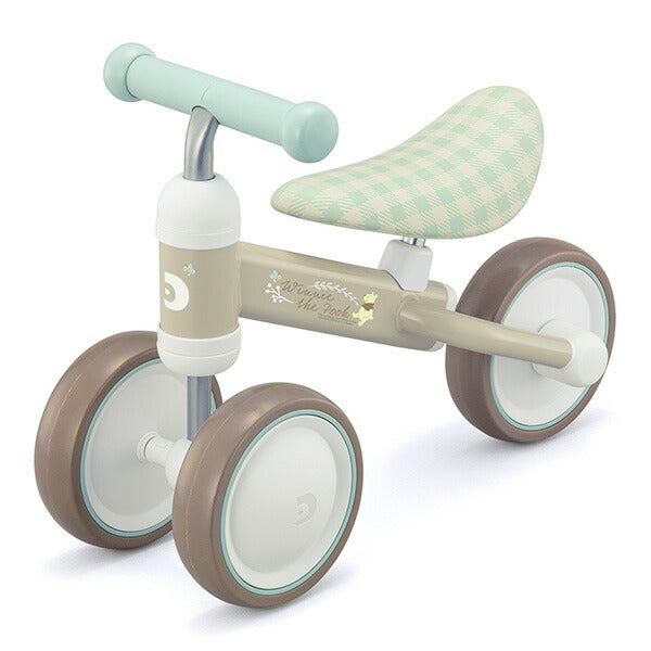 サドルの高さ調節で、長く遊べるようになった「D-bike mini プラス」に プーさんバージョンが新登場。「ニュアンスカラー」「アースカラー」のやさしい色の組み合わせはナチュラルで淡く、柔かいベビーとプーさんの雰囲気を演出します。