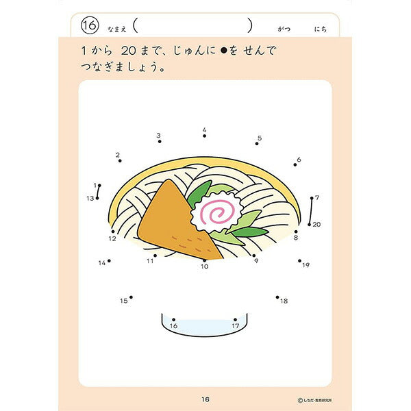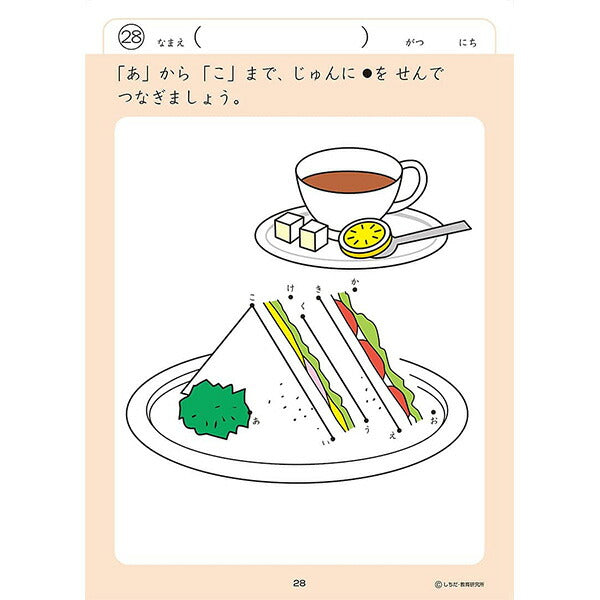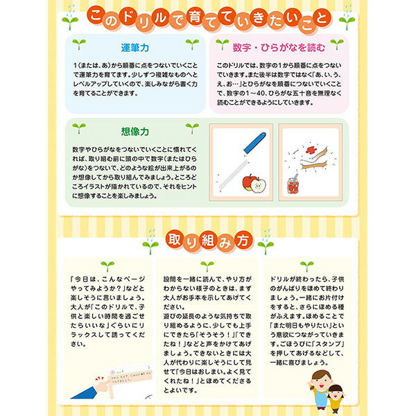 てんつなぎとは一般的には1からの数字をつないでイラストを完成させていきますが、本ドリルは問題の中盤から「あ」~順にひらがなを追ってつないでいきイラストを完成させる楽しく学べるドリルです。えんぴつの練習、そして数字、ひらがなの学習にもつながります。