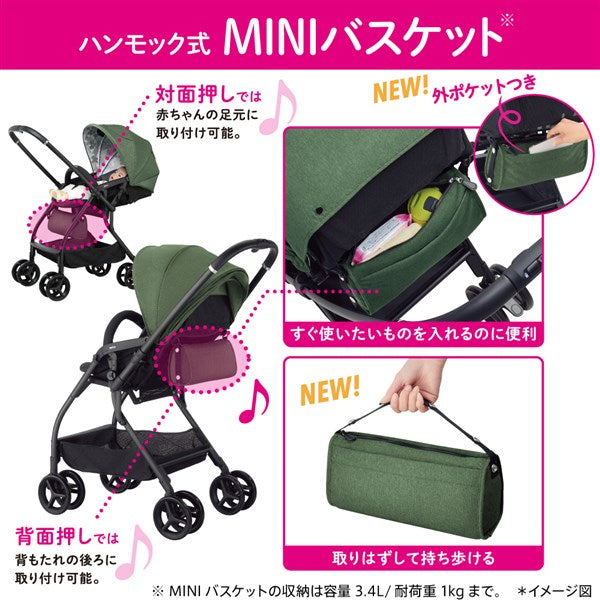 ペットボトルやスマートフォンなどの小物がスッと出し入れできるハンモック式ミニバスケット。対面時も背面時もママが手元で出し入れしやすい位置に吊り下げる事ができ、取りはずして持ち歩くこともできます。