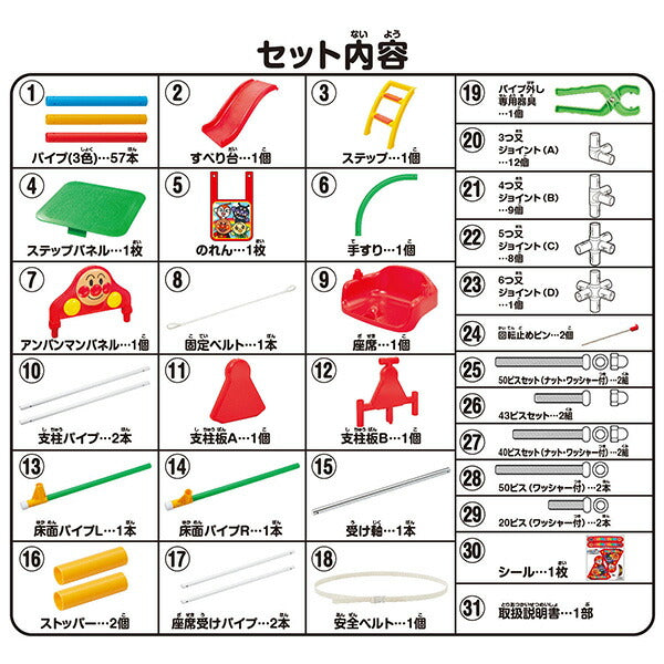 パイプ×57、すべり台×1、ステップ×1、のれん×1、手すり×1、ステップパネル×1、アンパンマンパネル×1、固定ベルト×1、座席×1、支柱パイプ×2、支柱板A×1、支柱板B×1、床面パイプL×1、床面パイプR×1、受け軸×1、ストッパー×2、座席受けパイプ×2、安全ベルト×1、パイプ外し専用器具×1、3つ又ジョイント×12、4つ又ジョイント×9、5つ又ジョイント×8、6つ又ジョイント×1、回転止めピン×2、ビス一式、シール×1、取扱説明書