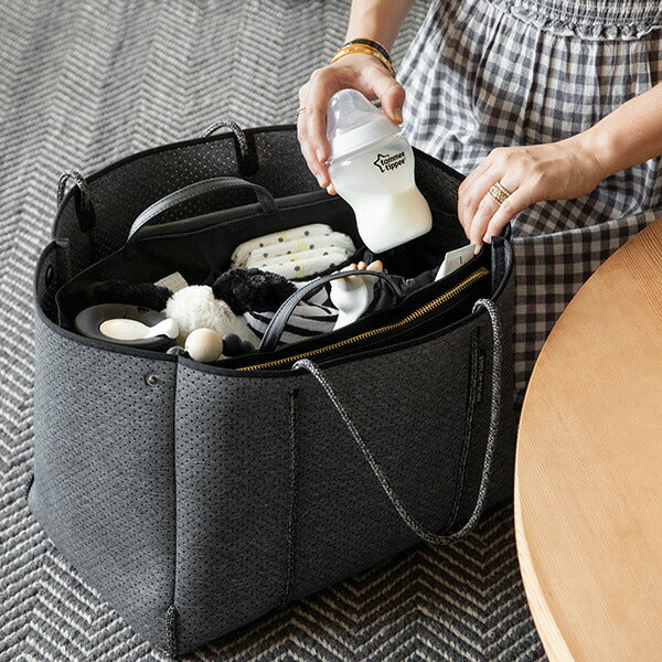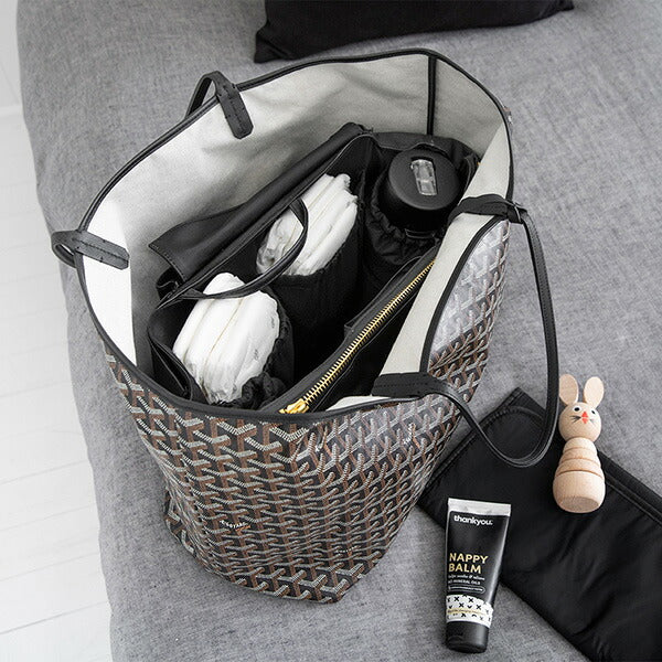 ナッピーソサエティーのバッグインバッグは、ママたちのお気に入りのデザイナーズバッグに機能性をプラスして、マザーズバッグに変身させます。ママのお気に入りのトートバッグやハンドバッグのスタイルを妥協せずにママバッグとしても使い続けられるように開発されたバッグインバッグが注目され、ナッピーソサエティーのブランドは世界中に広まりました。ママたちからの「必要」と「欲しい」の両方の声に応える商品を作りだしています。Lサイズの バッグインバッグは、中型から大型サイズのトートバッグに適しています。中でも、ルイ ヴィトン ネヴァーフルGM、ゴヤール サンルイGM、ステート オブ エスケープ Carryallなどに特にぴったりフィットします。