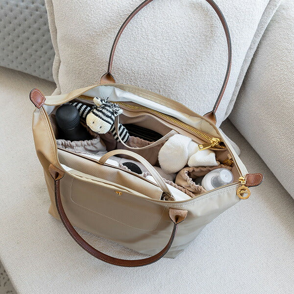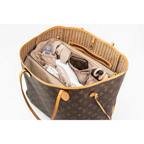ナッピーソサエティーのバッグインバッグは、ママたちのお気に入りのデザイナーズバッグに機能性をプラスして、マザーズバッグに変身させます。ママのお気に入りのトートバッグやハンドバッグのスタイルを妥協せずにママバッグとしても使い続けられるように開発されたバッグインバッグが注目され、ナッピーソサエティーのブランドは世界中に広まりました。ママたちからの「必要」と「欲しい」の両方の声に応える商品を作りだしています。Lサイズの バッグインバッグは、中型から大型サイズのトートバッグに適しています。中でも、ルイ ヴィトン ネヴァーフルGM、ゴヤール サンルイGM、ステート オブ エスケープ Carryallなどに特にぴったりフィットします。