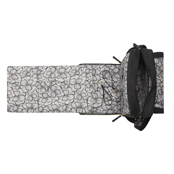 バッグの上を覆うフラップを開くと現れるオープンポケット。両サイドのファスナーを縦に開けば、取り外し可能なオムツ替えスペースに早変わり。