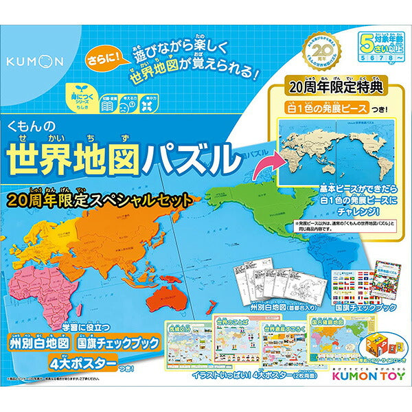 発売から20周年を迎えた「くもんの世界地図パズル」の特典付きセットです。遊びながら楽しく世界の国々の国名と位置を自然と覚えられます。20周年特典として、白1色の発展ピースが付きました。基本ピースができたら発展ピースにチャレンジしましょう。
