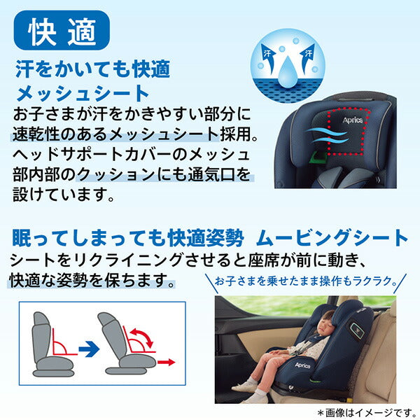 さらに、お子さまが汗をかきやすい部分に速乾性のある「メッシュシート」を採用、ヘッドサポートカバーのメッシュ部内部のクッションにも通気口を設けています。シートをリクライニングさせると座席が前に動き、快適な姿勢を保つ「ムービングシート」と合わせて、快適性を高めます。