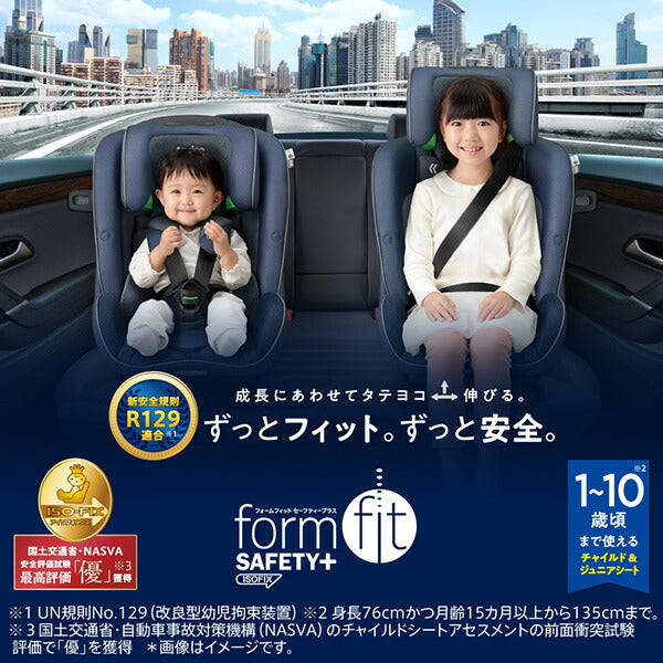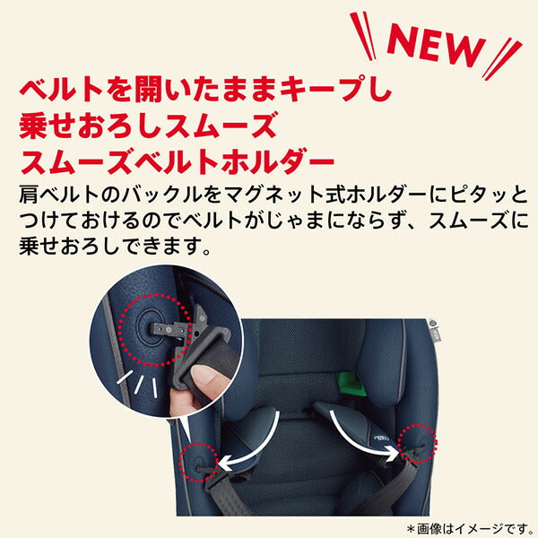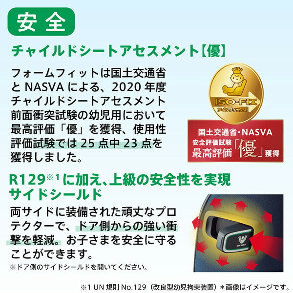 「フォームフィット ISOFIX セーフティープラス」は1歳頃から10歳頃※2まで使えるISOFIX取付タイプのチャイルド&ジュニアシート。新安全規則R129※1に適合。最先端の規則に対応し、お子さまを安全に守ります。乗せおろしの際にお子さまの肩ベルトがじゃまにならない「スムーズベルトホルダー」を新採用しました。