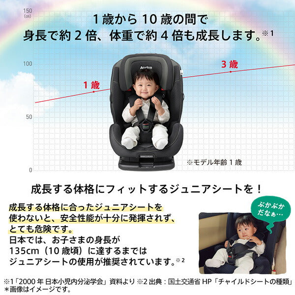 そして、フォームフィットに日本で初めて搭載した※4ひとつのレバーで成長に合わせて高さだけでなく横幅も調節できる「ぐんぐん成長レバー」をセーフティープラスにも搭載。1歳頃から10歳頃※2までの体格の変化に応じたフィットを実現し、安全性を高めます。