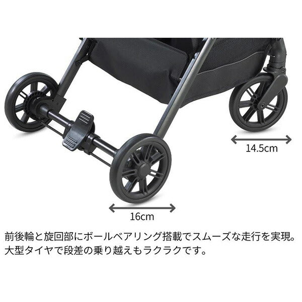 前輪145mm、後輪160mmの大型タイヤ搭載で、段差の乗り越えもラクラク。前後輪と旋回部にはボールベアリング内蔵で滑らかな押し心地を実現しています。