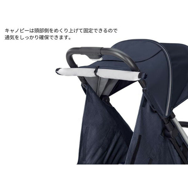 大型キャノピーはUPF50+でしっかり日差しを遮り、ファスナー伸長式で必要に応じて2段階に長さを変えられます。開閉式のメッシュウィンドウ付きでシートに風を通すことができ、頭部側はめくりあげて固定することができるので更にしっかり通気が確保できます。リクライニングは110~170°の間で無段階調整、フットレストは2段階に調整可能です。