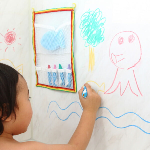 お風呂用キットパスは、濡れた壁にも滑らかに描けて、お風呂上りにシャワーで流してタオルで拭くだけで簡単に消えます。
