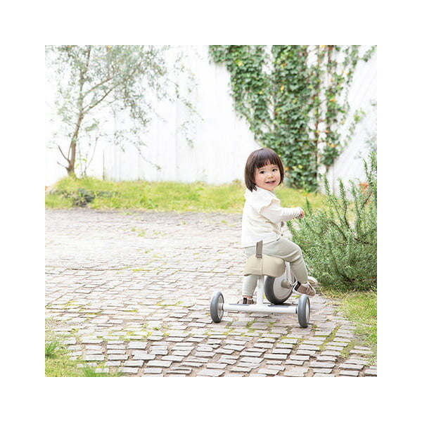 「お家でできたら、お外へぼうけん」小さいうちは、お家の中で乗り物遊びを楽ししんで。慣れてきたら、お外へぼうけんに出かけよう!低くて長いサドルなら成長に合わせてながーく遊べます。折りたためば玄関にスッキリコンパクト収納。